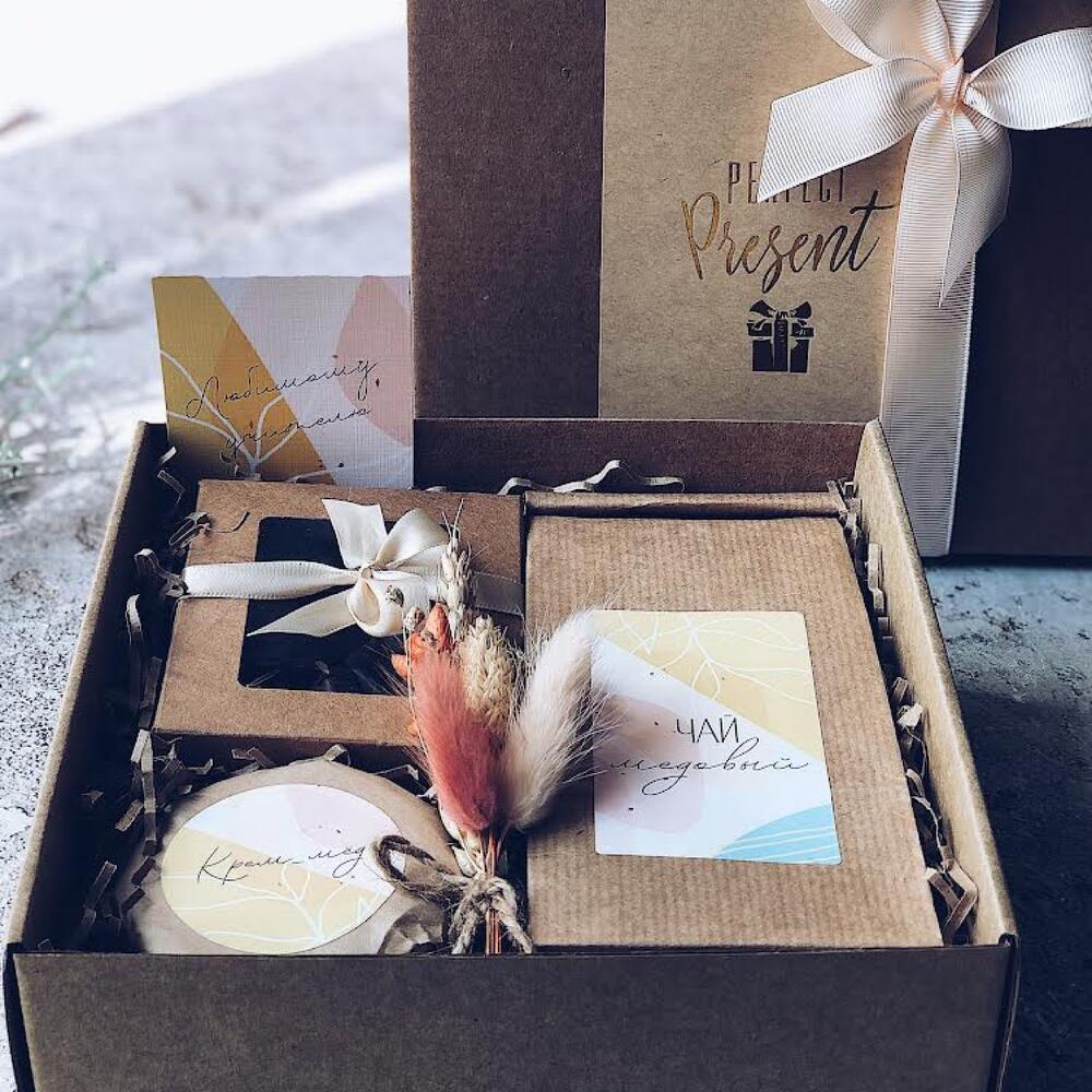 •открытка мини – 1 шт.•крем-мед с грецким орехом – 100 гр.•сухоцветы – 1 шт.•подарочная коробка с бантом – 1 шт.•чай черный с имбирем и медом – 50 гр.•чернослив с грецким орехом в шоколаде – 100 гр.