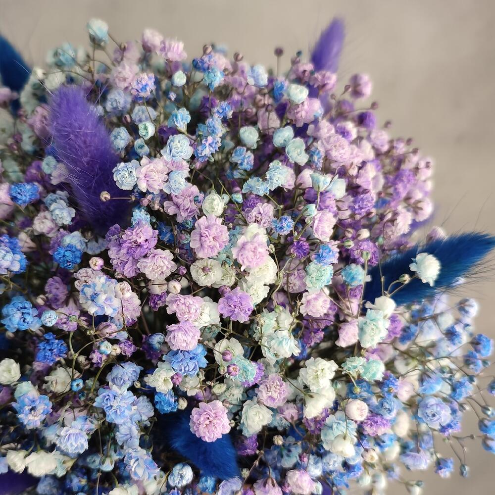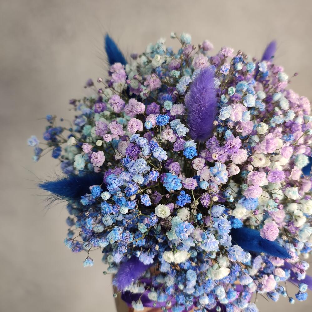 Ящик деревянный – 1 шт.Лагурус – 14 шт.Оазис флористический – 1 шт.гипсофила разноцветная – 6 шт.