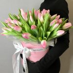 Тюльпан Голландский – 51 шт.Аквабокс – 1 шт.шляпная коробка 18*18 см – 1 шт.Пленка матовая – 1 шт.Лента атласная – 1 шт.