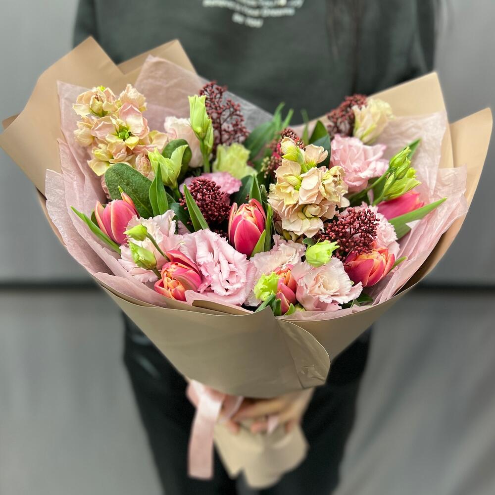Тюльпан пионовидный – 7 шт.Маттиола – 2 шт.Скиммия – 1 шт.эустома махровая розовая – 2 шт.Тишью – 2 шт.Пленка матовая – 3 шт.Лента атласная – 2 шт.
