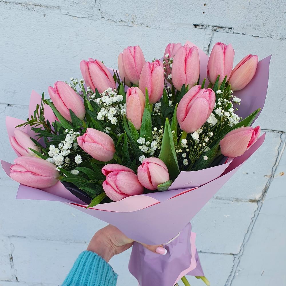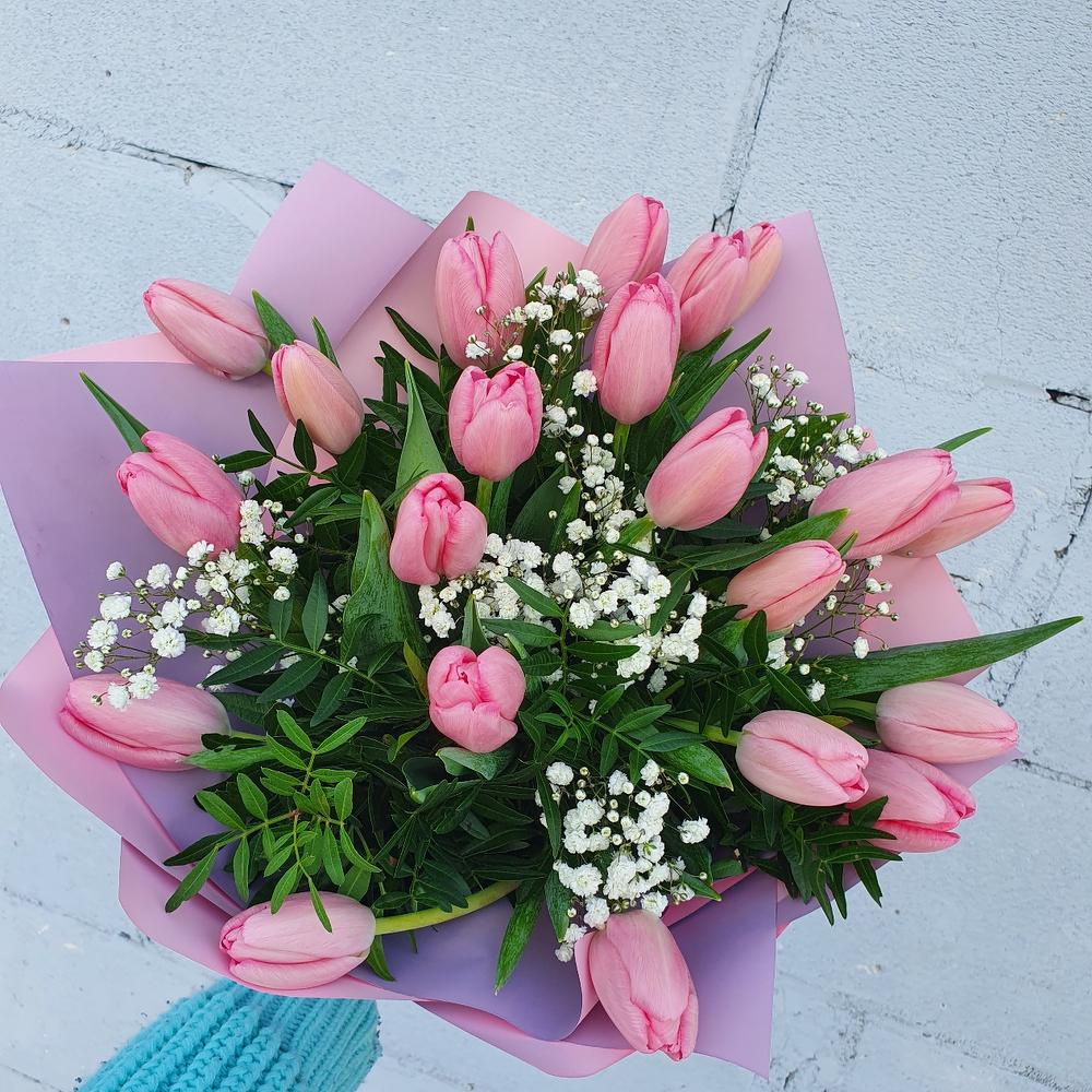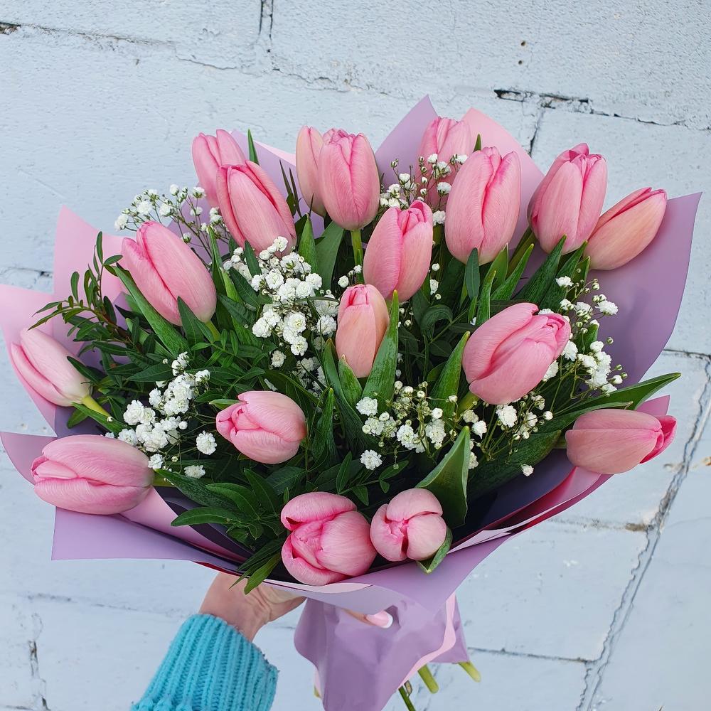 Тюльпан – 21 шт.Фисташка – 3 шт.Гипсофила – 1 шт.Упаковка дизайнерская – 1 шт.
