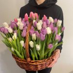 Тюльпан – 101 шт.Корзина плетеная – 1 шт.Оазис флористический – 4 шт.