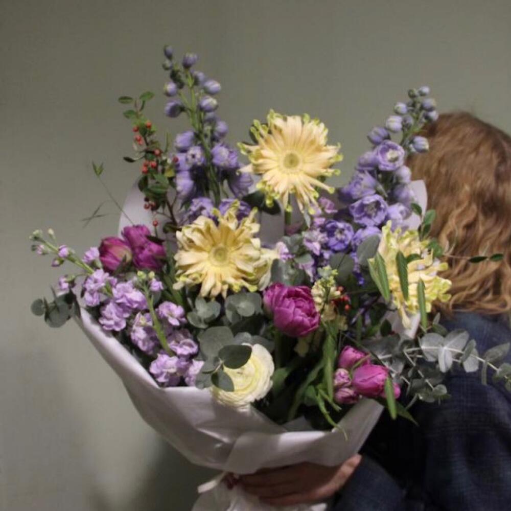 Дельфиниум – 2 шт.Тюльпан сортовой – 3 шт.Гербера – 3 шт.Ранункулюс – 1 шт.Маттиола – 4 шт.кизильник – 2 шт.кукушкины слезы – 2 шт.Эвкалипт – 5 шт.Упаковка – 1 шт.
