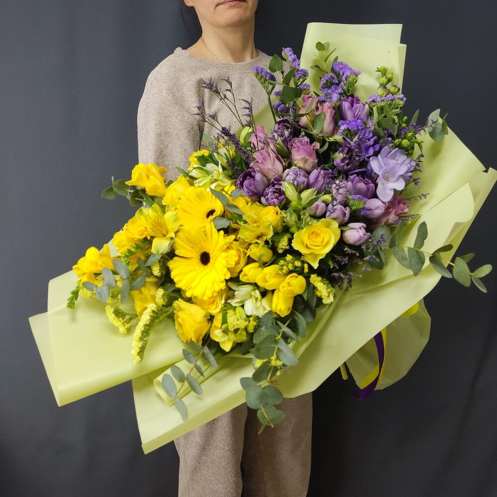 Лимониум – 3 шт.Статица – 4 шт.Тюльпан – 14 шт.Фрезия – 3 шт.Эвкалипт – 5 шт.Гербера – 1 шт.Дизайнерская упаковка – 1 шт.розы – 9 шт.