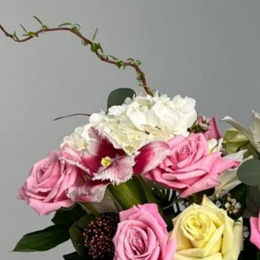 розы – 9 шт. Гортензия – 1 шт. Маттиола – 2 шт. Лилия – 1 шт. Эвкалипт – 1 шт. Скиммия – 1 шт. Салекс – 2 шт. Тюльпан – 1 шт. Ваксфлауэр – 1 шт.
