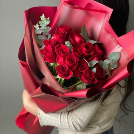 Красные розы 15 шт с эвкалиптом
