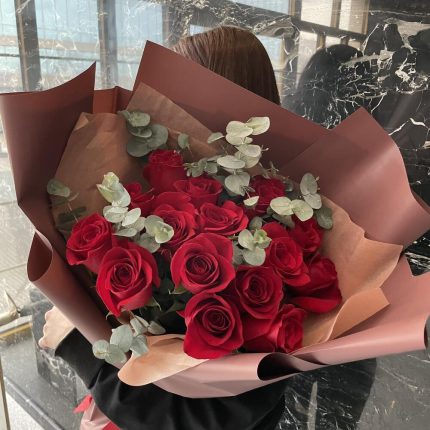 15 красных роз с эвкалиптом