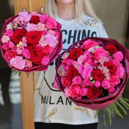 Большой букет из 151 красной и розовой розы «Преданное сердце» в дизайнерской коробке