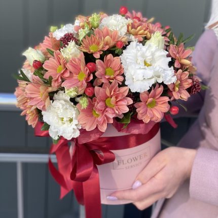 Коробка Жемчужина красоты из кустовых роз, альстромерии, эустомы и диантуса