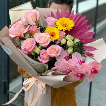 Пышный нежный и ароматный букет “Рассвет в любви” с розами, эвкалиптом, лизиантусом и генистой